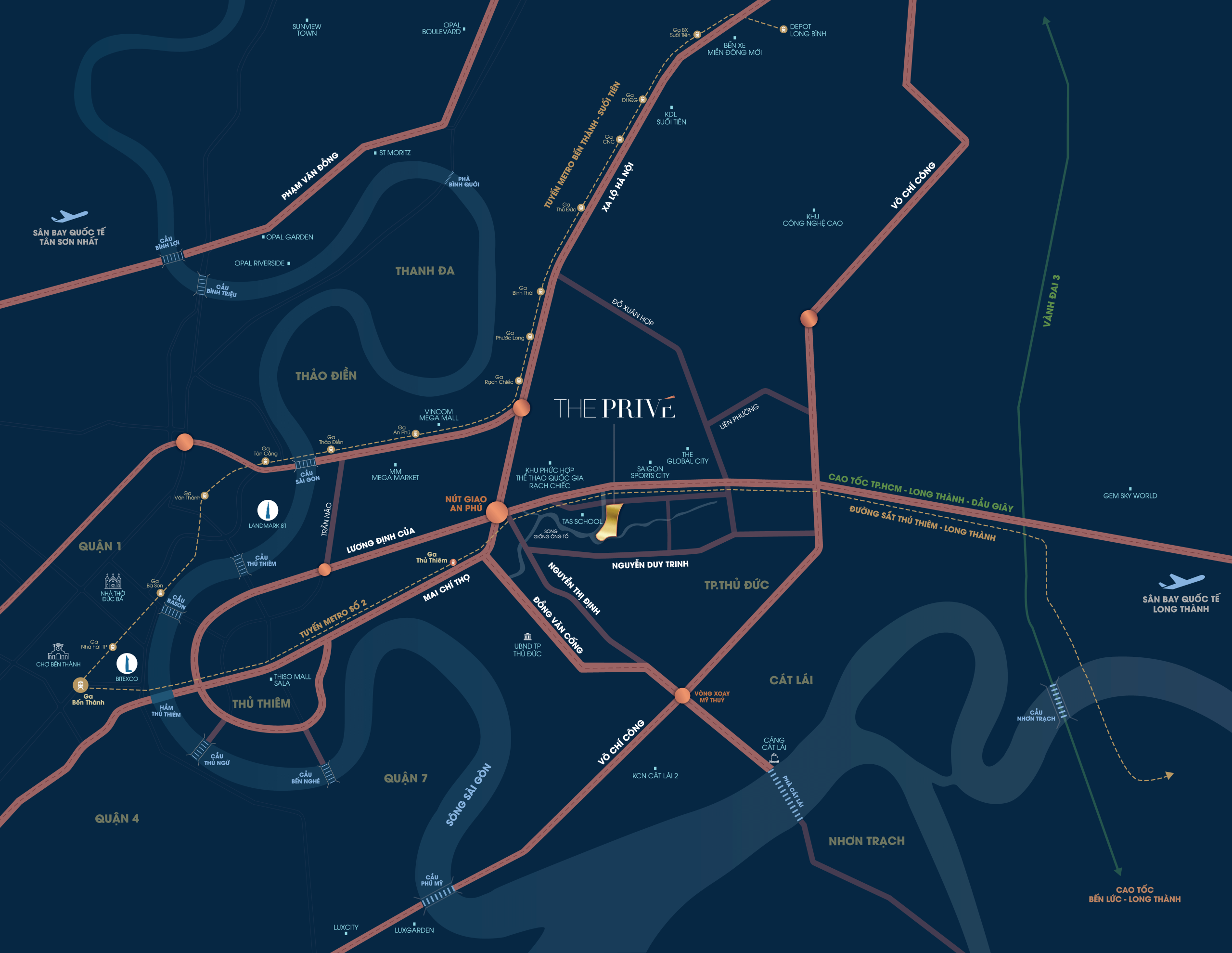 The Privé, vị trí đắc địa ngay mặt tiền đường song hành cao tốc TP HCM - Long Thành, cách nút giao An Phú chỉ 1km, dự án thuận tiện kết nối đến tất cả các khu vực của TP HCM mở rộng và sân bay Long Thành. Cơ hội sở hữu căn hộ compound hạng sang 3 mặt view sông ngay trung tâm TP HCM với mức giá chưa từng có - chỉ từ 99 triệu/m², bàn giao hoàn thiện nội thất cao cấp, cùng chính sách "phá đảo" thị trường bất động sản khu Đông TP HCM